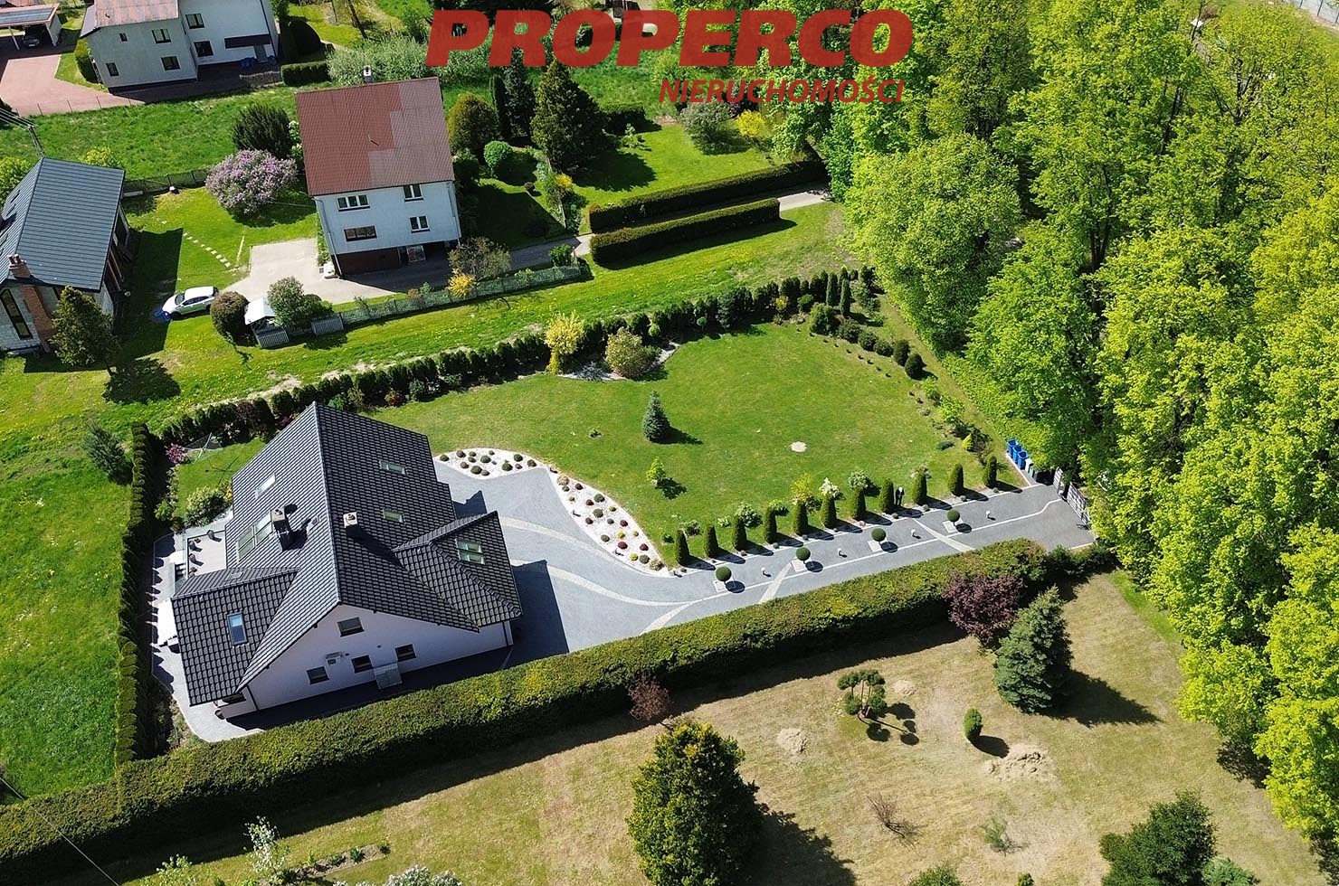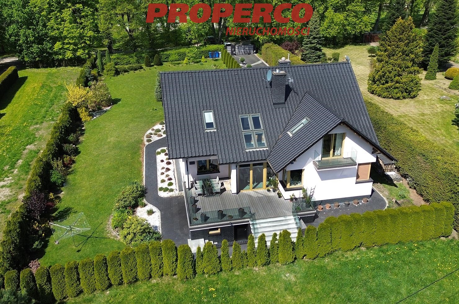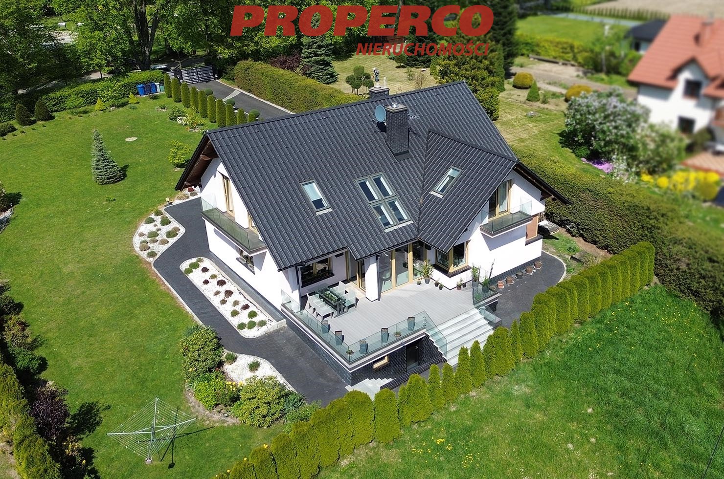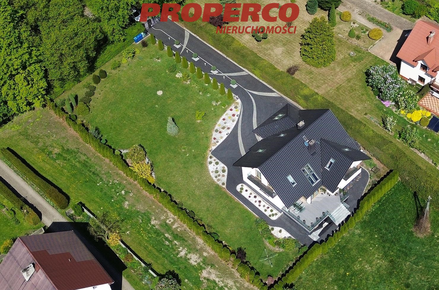 For sale: modern 6-room detached house with a usable area of 178.7 m² (total area 275.1 m²), located on the picturesque Aleja Lipowa in Oblęgorek, just 15 km from the center of Kielce. The property is situated on a 1,653 m² plot.