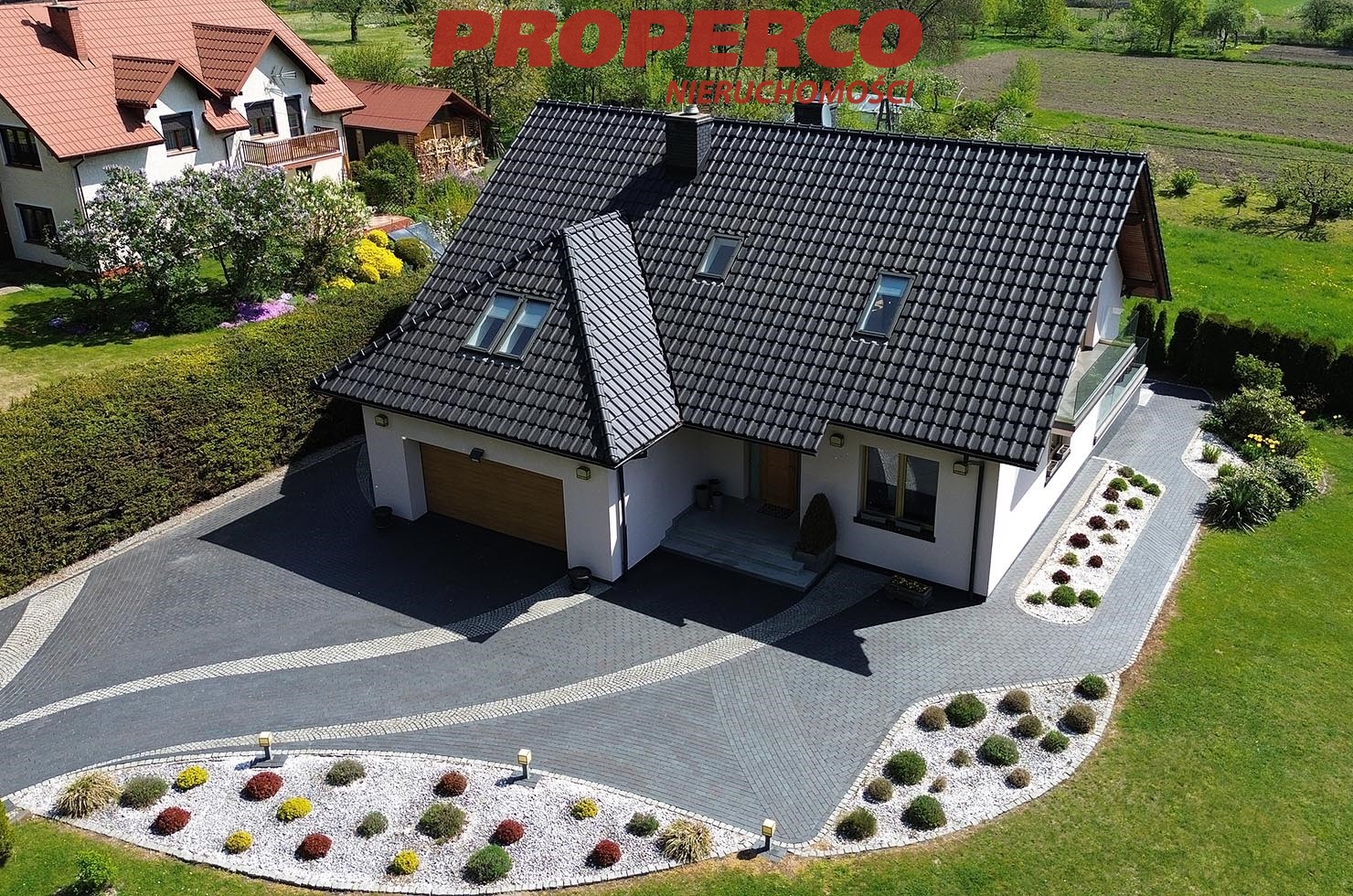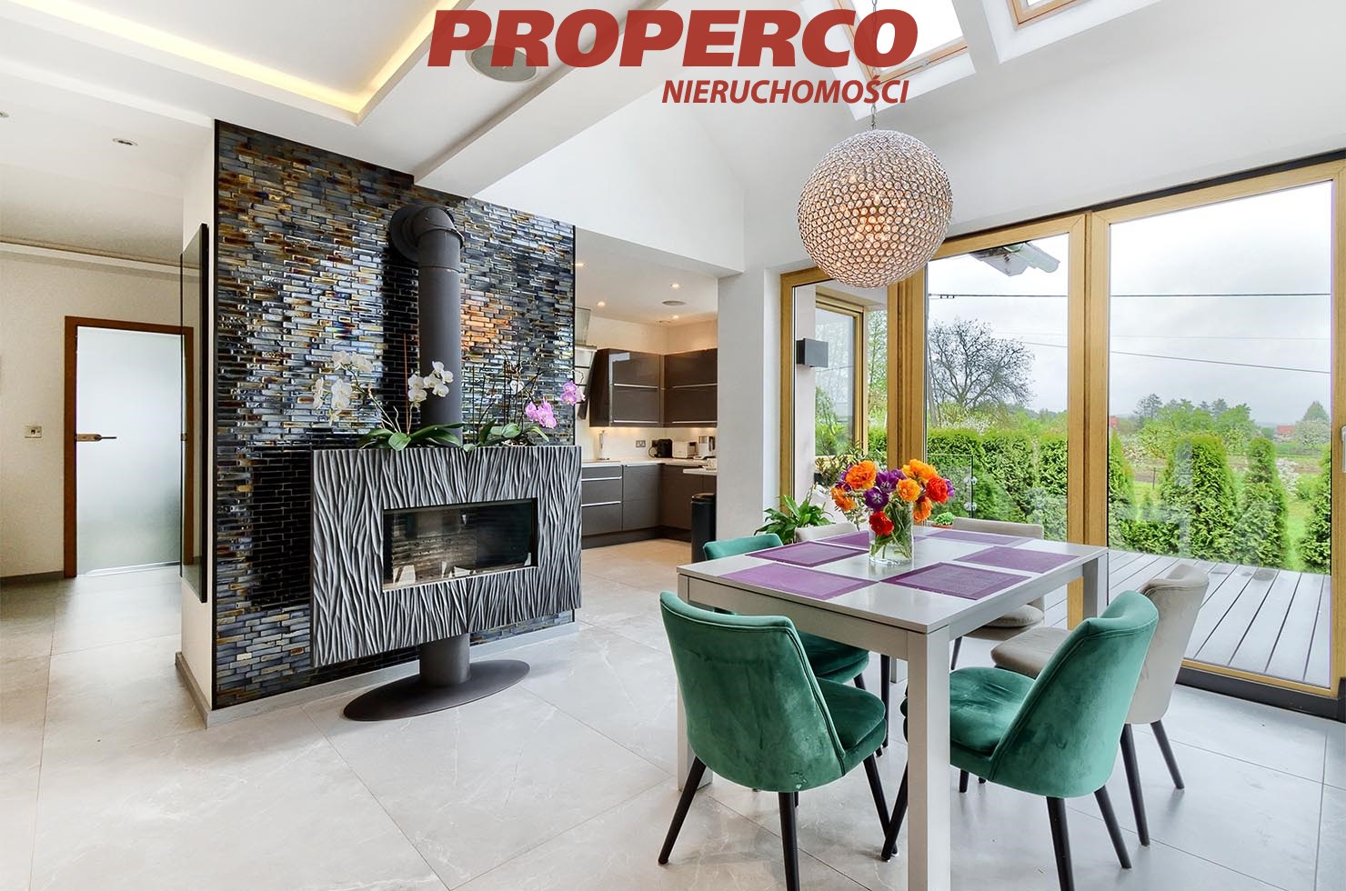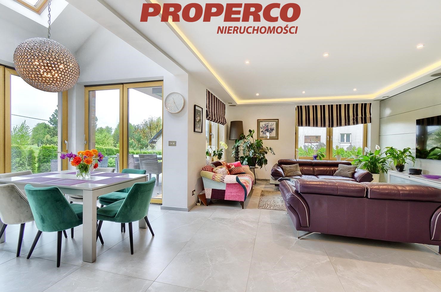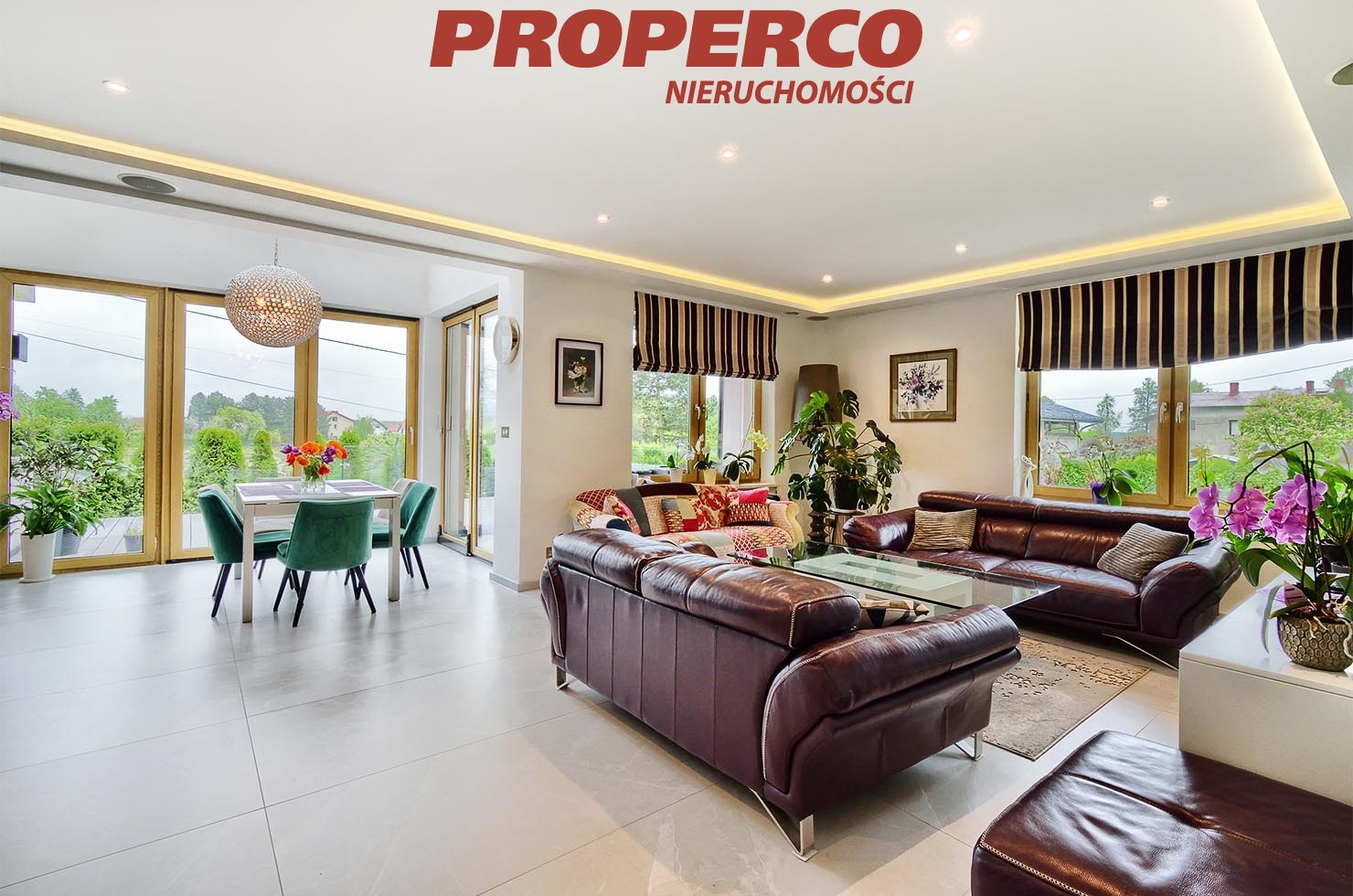 For sale: modern 6-room detached house with a usable area of 178.7 m² (total area 275.1 m²), located on the picturesque Aleja Lipowa in Oblęgorek, just 15 km from the center of Kielce. The property is situated on a 1,653 m² plot.