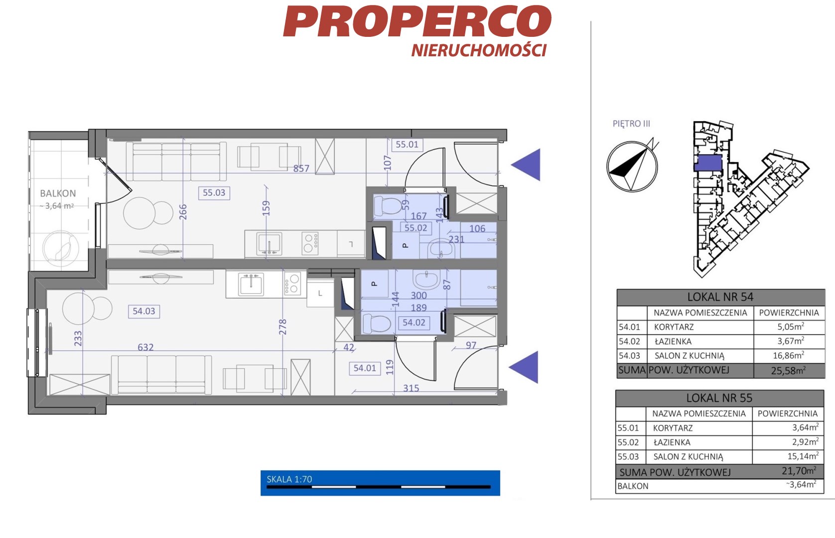 The apartment is divided into 2 smaller units with areas of 21.7 m2 and 25.58 m2. Each unit consists of 2 x living room with a kitchenette, 2 x bathroom, 2 x hallway, and one of the units also has a balcony (3.64 m2).