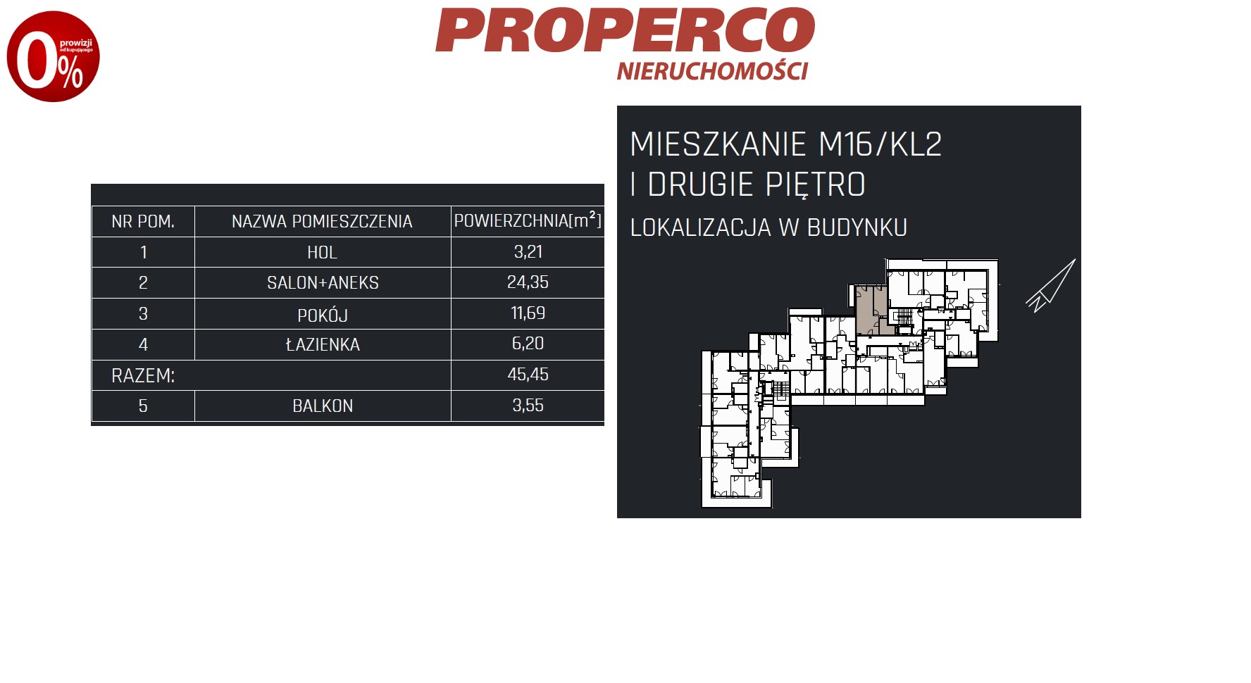 For sale: a 2-room apartment with an area of 45.45 m2, located on the 2nd floor in a modern development in Jędrzejów. The apartment is in developer standard.