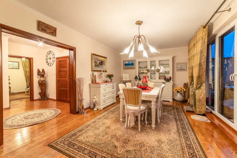 For sale: a two-level, 5-room apartment with a living area of 123.29 m² (total area including a double garage and basement: 162.20 m²), located on the first floor of a two-storey multi-family terraced building, on Wojska Polskiego Street.
