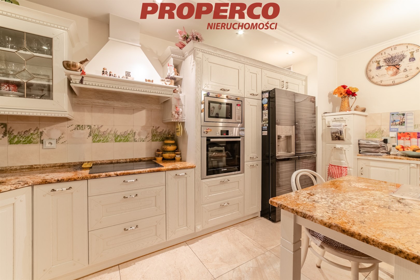 The kitchen has been designed with both functionality and aesthetics in mind and is equipped with wooden oak cabinetry, including practical cargo-type pull-out units, a granite table, and high-end household appliances: fridge-freezer, dishwasher, microwave, induction hob, and oven.