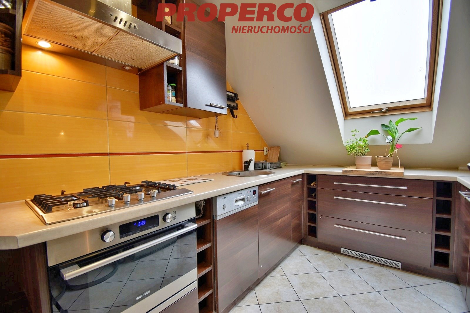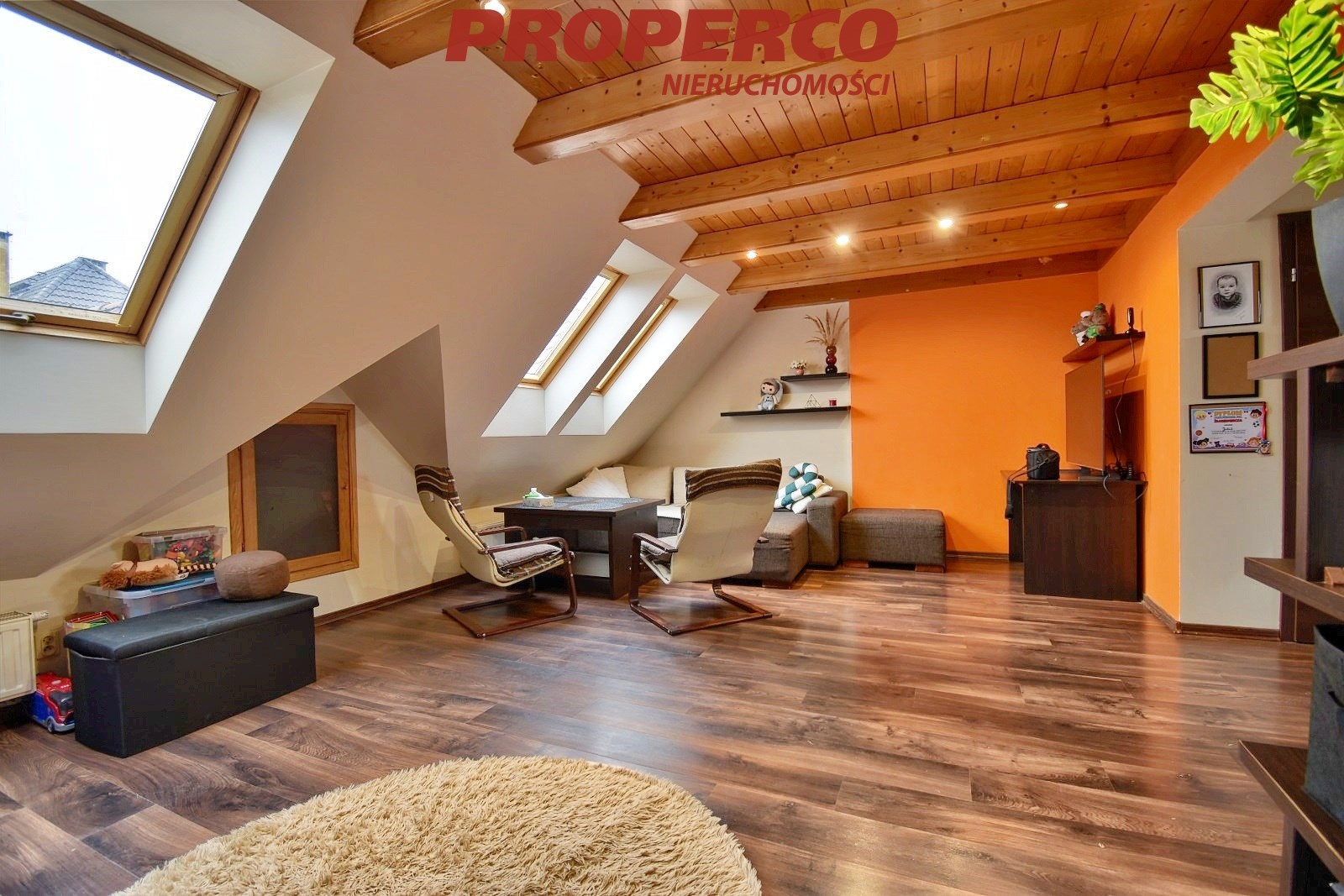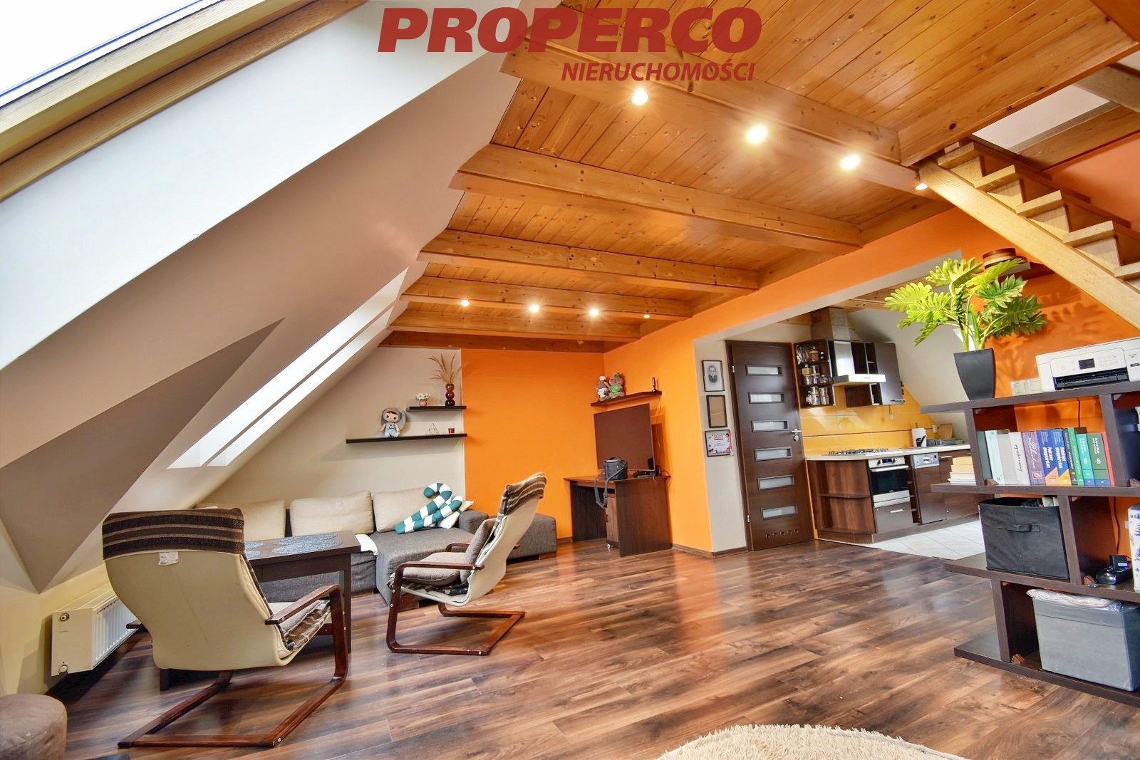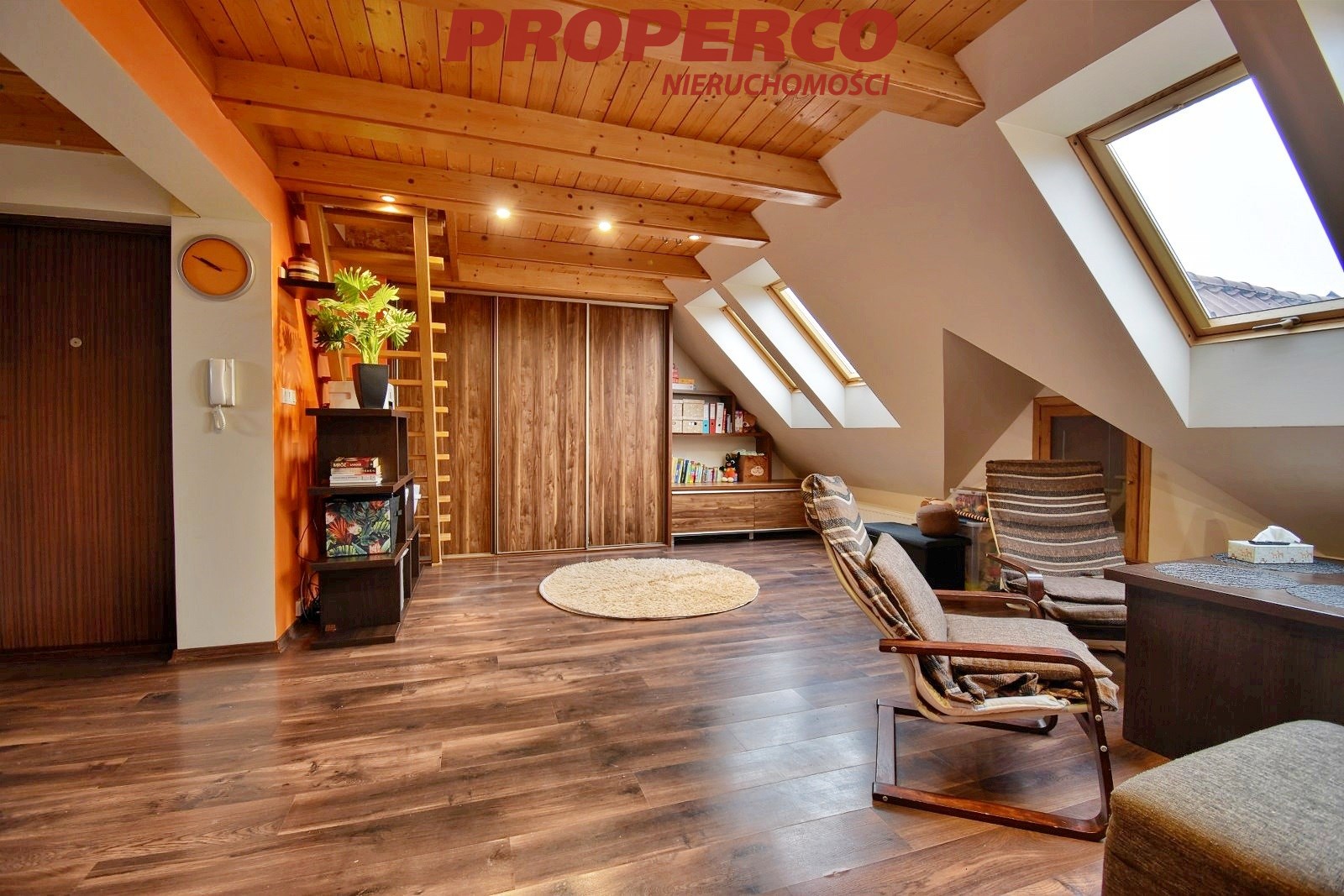 The apartment has dual exposure (north–south), providing natural light throughout the day. Roof windows give the interior a unique, cosy atmosphere and highlight its distinctive character.